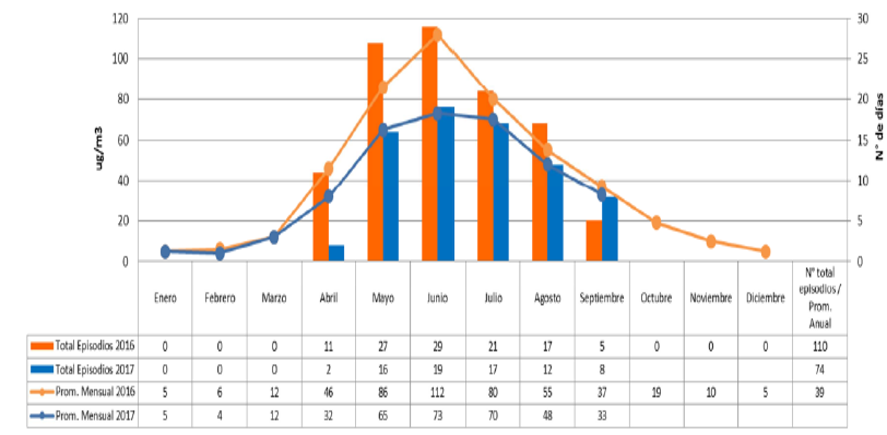 Existe una marcada estacionalidad en relación a los episodios de contaminación atmosférica por material particulado en donde se superaron los valores de las normas de calidad del aire. Esta estacionalidad se comprende desde los meses de abril a septiembre y dice relación con los periodos invernales y de bajas temperaturas lo que por consiguiente genera una mayor combustión de leña para satisfacer la mayor demanda energética y calórica de los hogares en periodos invernales. Como se aprecia a continuación estas condiciones generan gran número de episodios críticos por contaminación y mala calidad del aire, lo cual no ha variado significativamente desde la entrada en vigencia del PDA Temuco-Plc.