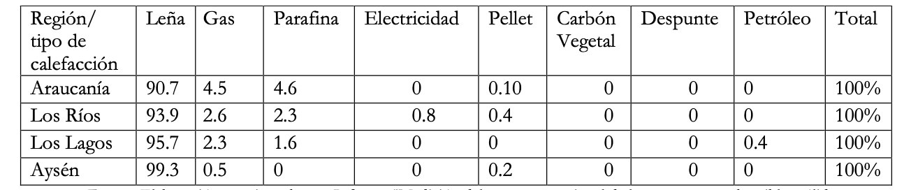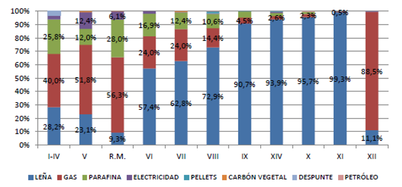 Un elemento central a hora de discutir y analizar la realidad local y regional del territorio es la persistencia y arraigo del principal combustible utilizado para la calefacción en la comuna y región. En este sentido, apreciamos de acuerdo a las figuras y tablas presentadas a continuación, que la región de la Araucanía es la cuarta a nivel nacional con mayor utilización de leña como combustible para calefacción con un 90.7%, a su vez el porcentaje de hogares que utilizan este combustible asciende al 88.9%.