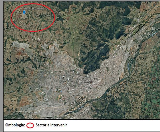El proyecto propuesto en el presente trabajo consta de a lo menos 2 espacios a intervenir; el primer de ellos es el Portal San Francisco, el cual es un conjunto habitacional emplazado en el sector nor-este de la comuna de Temuco, ubicado en la periferia de la ciudad. El conjunto habitacional o sector Portal San Francisco cuenta con aproximadamente 2.500 viviendas las cuales comenzaron su construcción en diversas etapas a contar del año 2008. Este espacio ha vivió un crecimiento exponencial siendo uno de los principales emplazamientos para la construcción y entrega de soluciones habitacionales por parte del Ministerio de Vivienda a través de SERVIU Araucanía.