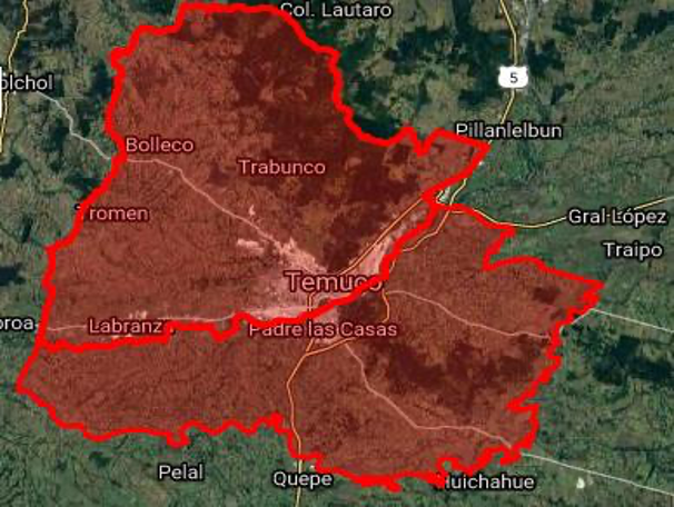 A su vez y como justificación para la intervención de este espacio, la cual dice relación fundamentalmente con un plan piloto de calefacción distrital, la cual requiere de un conjunto habitacional, parece idóneo y necesario intervenir el Portal San Francisco, puesto que, es un sector periférico, estigmatizado, que cuenta con amplio espacio para seguir desarrollándose, y cuyas viviendas datan desde el 2008 lo que supone una ventaja comparativa respecto de otros conjuntos habitacionales y una reducción de costos en relación al acondicionamiento térmico de las viviendas y por tanto al coste total del Proyecto dada su construcción posterior al año 2006, hito marcado por la entrada en vigencia del Decreto 192/2005 del Ministerio de Vivienda y Urbanismo el cual modifica la Ordenanza General de Urbanismo y Construcciones (Decreto 47/1992 Ministerio de Vivienda y Urbanismo) la cual viene a actualizar y aumentar los estándares técnicos para la edificación de nuevas viviendas, fundamentalmente para lo referido a lo que se denominaría la envolvente de la vivienda (Complejo de Techumbre, muros perimetrales y pisos inferiores ventilados). Finalmente, el Portal San Francisco cuenta con altos niveles de contaminación atmosférica por MP 10 y 2.5 y se encuentra dentro de la zona declarada como saturada y de la zona de aplicación de restricción de combustión de leña como se aprecia a continuación.