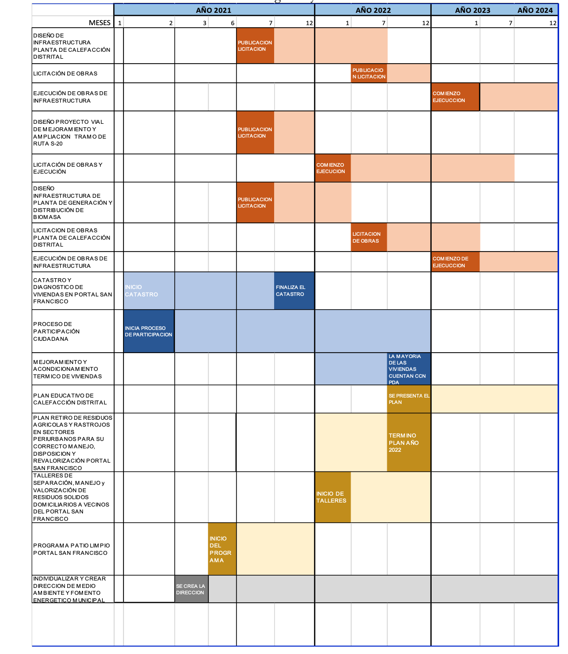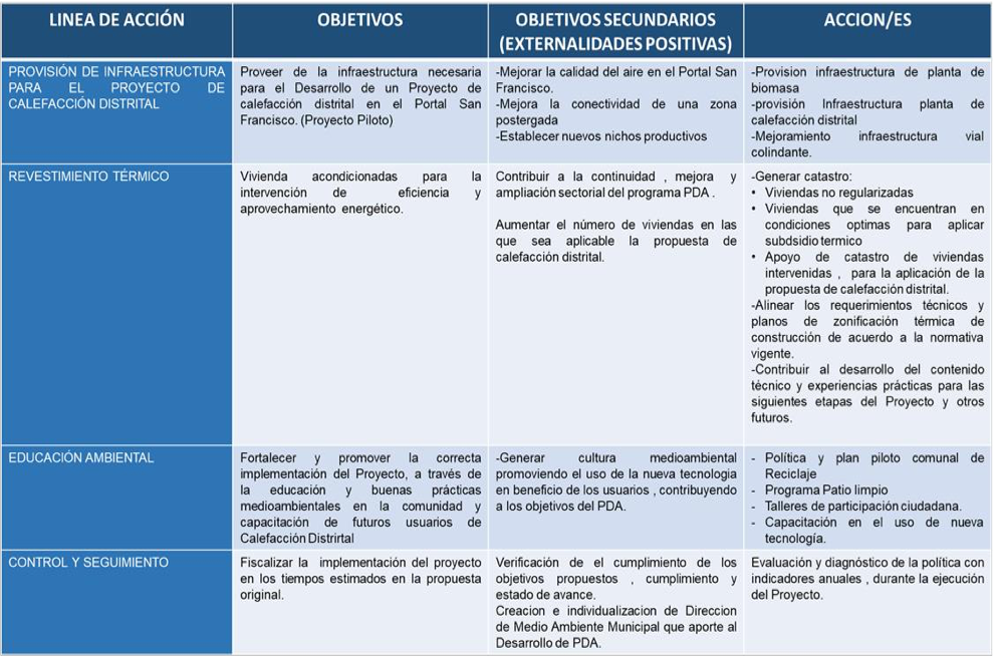 La presente política busca generar un proyecto de calefacción distrital para el Portal San Francisco en la Comuna de Temuco, para estos efectos se han delineado 4 líneas de acción o dimensiones con sus respectivos componentes y actividades a desarrollar para la instalación y funcionamiento de la planta de biomasa.