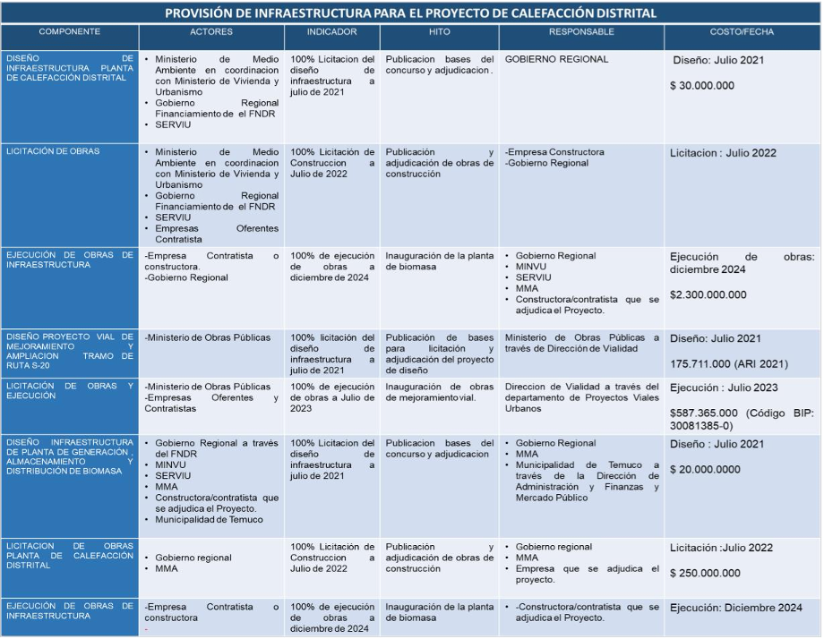 Esta línea de acción contempla el desarrollo en todas sus etapas (diseño, licitación y ejecución) de dos proyectos de infraestructura fundamentales y necesarios para la calefacción distrital. En primer lugar, está la obra de la planta de calefacción distrital y todos sus elementos constitutivos como la red de distribución, cañerías y empalme a las viviendas. Este componente sumando las etapas de diseño, licitación y ejecución proyecta una inversión total de $ 2.330.000.000 millones de pesos. Las principales fuentes de financiamiento serán a través del Fondo Nacional de Desarrollo Regional del Gobierno Regional de la Araucanía. El segundo proyecto para provisión de infraestructura para efectos de este proyecto, es una planta de generación, almacenamiento y distribución de biomasa proveniente tanto de los deshechos forestales como de los procesos de recolección que implementara el municipio a través del retiro de residuos agrícolas y restrojos en sectores periurbanos de la comuna. El diseño, licitación y ejecución de las obras para proveer de la planta de generación, almacenamiento y distribución de la biomasa tendrá un costo total de $ 270.000.000 millones de pesos. Finalmente, como último componente está el diseño y ejecución de obras de mejoramiento de la ruta S-20, la cual conecta Temuco con la comuna de Chol Chol, y es la principal vía de conexión entre la futura planta de generación, almacenamiento y distribución de biomasa, así como también con la futura planta generadora de calefaccion distrital. Coincidentemente y para efectos de éste proyecto da la casualidad que actualmente se encuentra en ejecución un proyecto de mejoramiento de la ruta S-20 el cual se encuentra en etapa de diseño y estudios. El costo total de esta obra alcanza los 763.076.000 y se encuentra individualizado en el Banco Integradode Proyectos con el código Bip 30081385-0