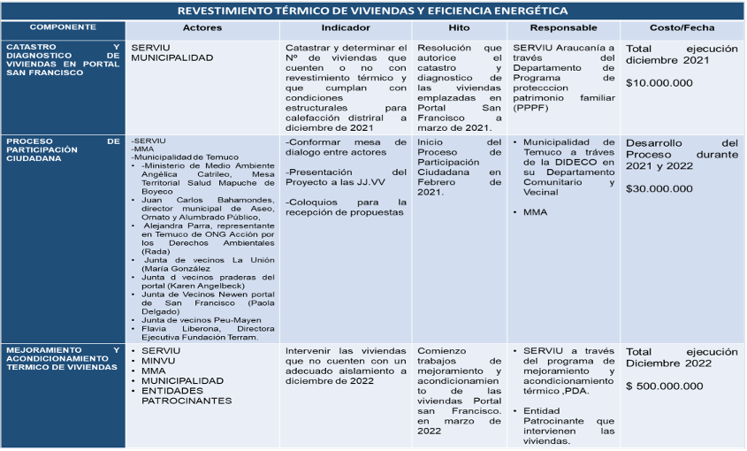 Como primer componente a desarrollar para ejecutar esta línea de acción, nos vemos en la necesidad de generar un catastro para determinar el número total de viviendas a intervenir, aquellas que se encuentren en regla y condiciones de recibir el proyecto, e identificar aquellas que no para intervenirlas y estandarizar el criterio de eficiencia energética en todas las viviendas del sector. Un elemento a favor, resulta ser que, dada la data de construcción de estas viviendas, en teoría ya vienen con otros estándares de construcción, sobre todo en el que respecta a el aislamiento térmico de estas, sin embargo, resulta necesario y pertinente un catastro en detalle para su posterior intervención. Este tendrá un costo de $10.000.000 El segundo componente a desarrollar, es iniciar un proceso de participación ciudadana amplio e inclusivo no solo de manera testimonial, sino que de manera participativa y en concordancia con la comunidad, recibiendo sus propuestas y delineando en conjunto las acciones a seguir a futuro. Para estos efectos se proponen tres acciones concretas; la creación de una mesa ampliada que englobe a la totalidad de actores con fines de presentación y discusión del proyecto, así como la coordinación de los trabajos a realizar. Sumado a esto, se incluye la presentación del proyecto a las juntas de vecinos y habitantes del Portal San Francisco, lo cual finalizara con talleres y coloquios de trabajo para la recepción de propuestas u observaciones por parte de la ciudadana y organizaciones de la sociedad civil que quieran contribuir en este proyecto. El costo del desarrollo de estas actividades será de $ 30.000.000 y los desarrollará la Municipalidad de Temuco en conjunto con el Ministerio de Medio Ambiente. Finalmente, y como tercer componente y que cierra la línea de acción referente al revestimiento térmico y eficiencia energética de viviendas, está el acondicionamiento térmico de las viviendas. Este componente se ejecutará posterior al proceso de catastro de viviendas y solo en aquellas que tengan deficiencias estructurales y no cuenten con una adecuada aislación térmica, el costo proyectado de esta acción es de $ 500.000.000 de pesos, los cuales pueden variar en función del no de viviendas que requieran de intervención y mejoramiento.