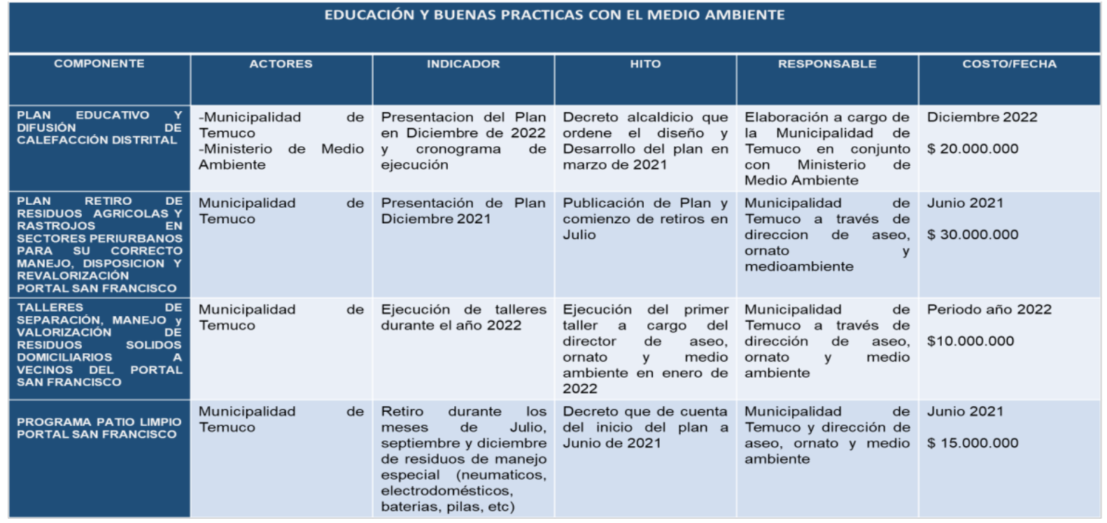 Esta línea de acción está compuesta por cuatro componentes, dos de ellos destinados directamente al funcionamiento como tal de la planta de calefacción distrital y dos destinados a fomentar y promover hábitos y culturas amigables con el medio ambiente a modo de ir transitando de manera incremental hacia un sector más limpio y descontaminado no solo a través de la reducción de emisiones de material articulado, sino que también a través del aprovechamiento y valorización de los mal llamado deshechos reduciendo de paso la generación de los residuos sólidos domiciliarios. Por tanto, el primer componente de esta línea de acción dice relación con un plan educativo de calefacción distrital a cargo de la Municipalidad y en coordinación en calidad de experto del Ministerio de Medio Ambiente. El objetivo de este plan es entregar e informar a la población residente del sector a modo de capacitación para que conozcan y hagan correcto uso de la futura calefacción distrital, sumado al cambio de hábitos y acciones dentro del hogar para que contribuyan en una mayor eficiencia energética y aprovechamiento térmico de la calefacción distrital dentro del hogar. Este plan tendrá un coste de $ 20.000.000 millones de pesos y su ejecución se contempla para diciembre de 2022. El segundo componente dice relación con un plan de manejo que contribuya a la limpieza de terrenos y patios en sectores periurbanos de la comuna, esencialmente en el radio del portal san francisco y el ex vertedero Boyeco. Esto dice relación con revalorizar deshechos y restrojos agrícolas como potencial fuente de generación de biomasa óptima para la planta de calefacción distrital. A su vez, se busca contribuir en disminuir la quema ilegal de deshechos en predios particulares, lo cual se condice, además, con lo establecido en el PDA. Para este plan se contempla una inversión anual de $ 30.000.000 millones de pesos, los cuales pueden incrementar de acuerdo al desarrollo y eficiencia del plan en años venideros. El tercer componente y que no tiene una vinculación directa en relación al proyecto, dice relación con la realización de talleres en el portal san francisco para la separación, valorización, reciclaje y manejo de residuos sólidos domiciliarios, la finalidad de este componente versa en promover y fomentar el tránsito hacia la disminución de los residuos sólidos domiciliarios del sector, contribuyendo de esta forma en el cambio climático y promoviendo al Portal San Francisco como un ejemplo pionero de cambio y nuevas experiencias replicables ya sean en la misma comuna de Temuco u en otras comunas del país. El coste de estos talleres asciende a $ 10.000.000 de pesos, destinados a informar y promover la separación, valoración, reutilización y reciclaje, lo cual se complementa con la instalación de puntos verdes en el sector y contenedores de plásticos, experiencia exitosa dentro de la comuna. Finalmente, el ultimo componente en concordancia con el anterior, busca implementar un programa de patio limpio en el portal san francisco, a través de la recolección de residuos de difícil disposición tales como baterías, neumáticos, electrodomésticos y pilas entre otros durante 3 veces a lo largo del año. Esto dice relación nuevamente con contribuir a la valorización de los espacios de los vecinos del portal, y nuevamente contribuir en el combate del cambio climático a través de la correcta disposición de este tipo de residuos, lo que sumado a los talleres de separación, reciclaje y revalorización de deshechos buscan posicionar al portal san francisco como un conjunto habitacional sustentable, limpio y eficiente dentro de la comuna.