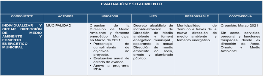 Respecto de esta última dimensión, es menester señalar que uno de los elementos claves a la hora de pensar y diseñar políticas públicas es la correspondientes evaluación y seguimiento de estas. Por consiguiente, se propone dentro de la última línea de acción, la creación a individualización de la Dirección de Medio Ambiente y Fomento Energético perteneciente a la municipalidad de Temuco. El objetivo de esta nueva dirección es dar dedicación exclusiva a proyectos, planes y programas medioambientales y que contribuyan en este sentido y separarlo de Aseo, Ornato y Luminaria Pública a través del traslado de funcionarios. A su vez, esta nueva dirección, tendrá por objetivo el monitoreo y seguimiento de los distintos hitos y actividades propuestas en el contexto de este proyecto, a través de la generación de indicadores de cumplimiento que midan el real avance de la política con la finalidad de corregir errores de planificación a tiempo. Se propone que existan a lo menos una evaluación anual y actualización de estos indicadores.