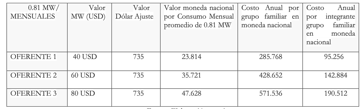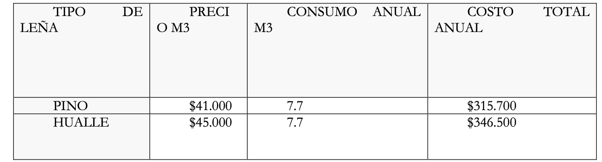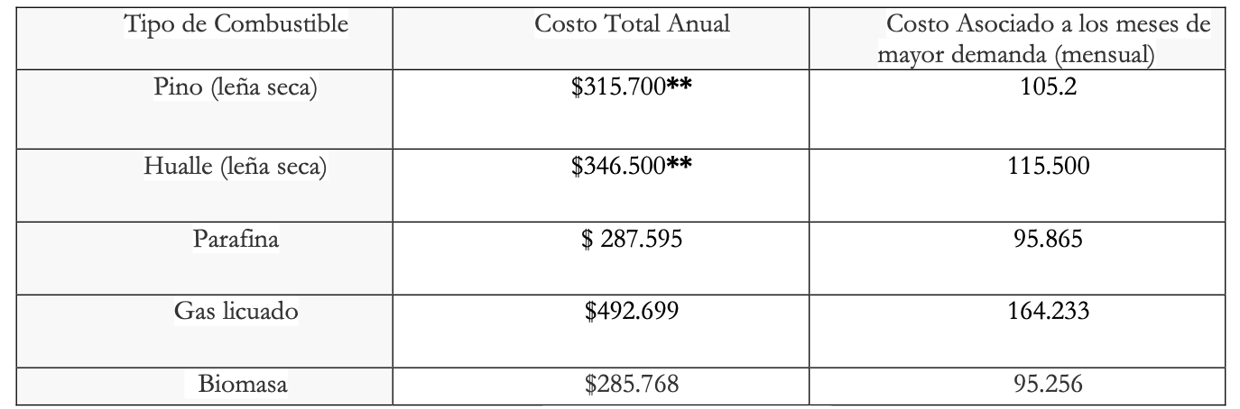 De acuerdo a reportes regionales elaborados por SERNAC Araucanía (Reporte de comercio formal de leña y Pellet, 2020) el rango de precio por Metro cúbico establecido en comercios formales dedicados a la venta de leña, fluctúa, para el mes de junio de 2020, entre los $41.000 y $45.000 pesos, dependiendo del tipo de leña, sea esta Pino o Hualle respectivamente. Si consideramos que el consumo promedio de una familia compuesta por 3 integrantes en la Araucanía corresponde a 7.7 metros cúbicos anuales, los costos totales en un año promedio fluctúan entre los $315.700 y $346.500, sin contar la existencia de otro tipo de artefactos de calefacción/o cocción. Para efectos de licitación del proyecto, se establecerá como criterio de selección a aquel oferente que pueda desarrollar el proyecto bajo la especificación técnica de entregar un servicio de termocalefacción, con un rango de potencia establecido de 500 KWE y 3 MWE Mensual de consumo por hogar, con un costo de operación de 40 USD$, el cual puede fluctuar en otros valores no superiores a 80USD$, en el caso de encontrarse desierto el concurso por falta de oferentes. Los rangos y valores estimados, se consideraron de acuerdo a recomendaciones técnicas de organismos especializados, los cuales pueden verse afectado ya sea por factores de mercado o bien, consideraciones técnicas que puedan emerger al momento de ejecutar el proyecto.