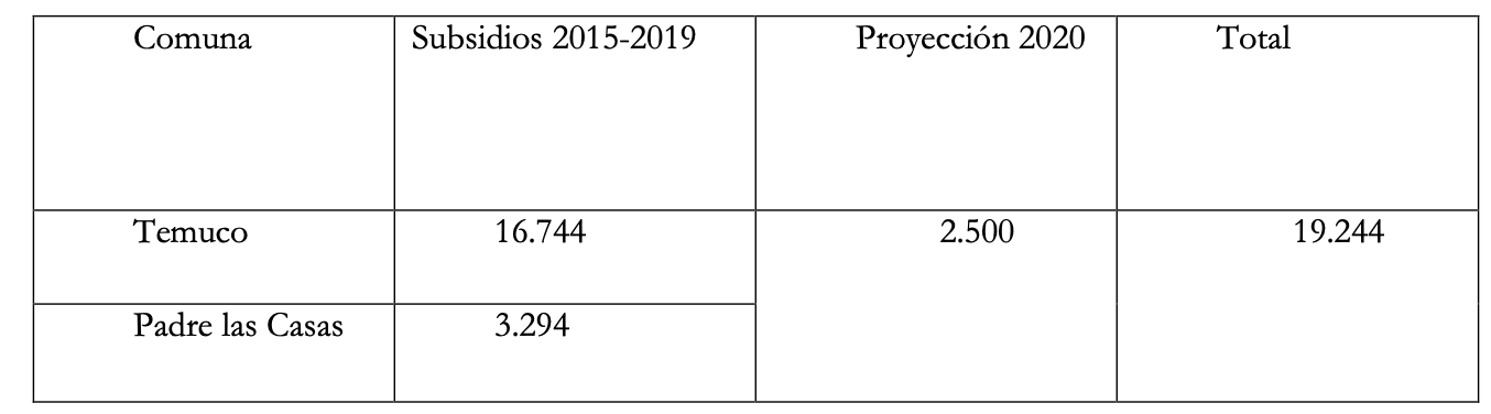 En relación a los subsidios de acondicionamiento térmico en el marco del PDA, al mes de mayo de 2020, el Ministerio de Vivienda a través de la Secretaria Regional Ministerial de la misma cartera, señalo que se han ejecutado en la comuna de Temuco 13.450, mientras que en Padre las Casas un total de 3.294, los cuales totalizan 16.744 lo que corresponde a un 41.86% de estado de avance respecto de la meta propuesta. Del mismo modo aseveran, durante el pasado 2020 se preveía la adjudicación de 2.500 nuevos subsidios logrando un total de 19.244.