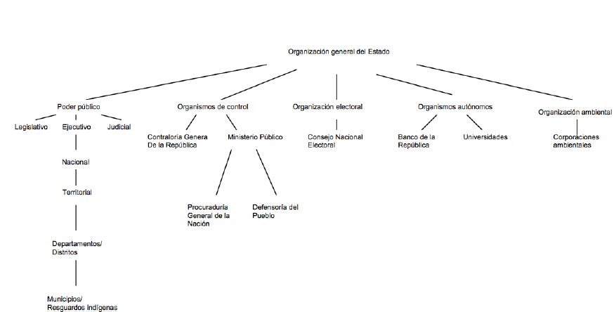 El Estado Colombiano está compuesto por tres ramas de poder público, a saber, el ejecutivo, legislativo y judicial. Además de estos organos hay otros autónomos e independientes que funcionan para lograr los fines del Estado. Esta división se encuentra presente en todos los niveles de gobierno, desde el nivel nacional hasta el territorial.