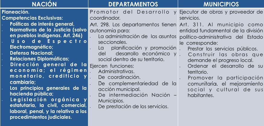 En lo concerniente a las competencias de cada nivel de gobierno, se puede decir en términos generales que la nación tiene la función de definir política pública y planear, el departamento de coordinar y ser el intermedio, y finalmente el municipio es quien ejecuta y provee los servicios. Ahora bien, la nación tiene las siguientes competencias exclusivas: definir la normatividad en justicia (salvo pueblos indígenas), exclusividad en el uso de espectro electromagnético, defensa nacional, relaciones diplomáticas, direccionamiento general de la economía, entre otras.