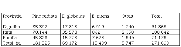 La mitad de las tierras útiles de la región de Ñuble se destinan a los forestal, un 12% a praderas y un 30% a agricultura (Flacso, 2018). De este modo, Ñuble se convirtió en el clásico territorio de extracción de recursos naturales, en gran volumen o alta intensidad, y que están orientados esencialmente a ser exportados como materias primas sin procesar, o con un procesamiento mínimo (Gudynas, 2014). La tabla uno muestra la supremacía absoluta de los monocultivos forestales en la zona: