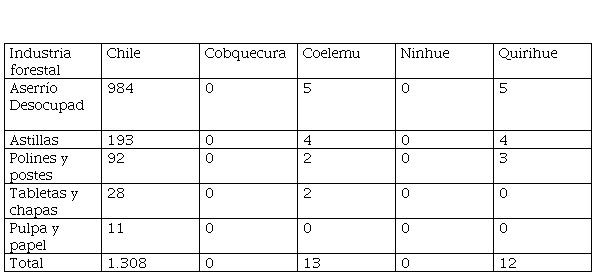 La industria forestal es alrededor del 2.3 del PIB, exporta en torno a 5,3 billones de dólares (INFOR, 2018), ubicándose con la pesca/acuicultura (6 billones), la agricultura/vinos (10 billones) y la manufactura (ocho billones) entre los pilares de la economía exportadora chilena. El caso de Ñuble cobra ribetes extremos la falta de clúster territorial, ya que las cuatro comunas de mayor presencia forestal en la costa de dicha región, muestra a dos comunas sin ni siquiera un aserradero, y las dos más populosas de la provincia del Itata, Coelemu y Quirihue, con una participación menor. La tabla dos muestras en el Itata la existencia de sólo algunos aserraderos en las comunas estudiadas: