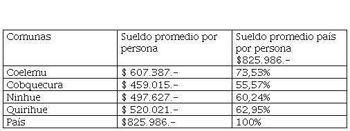 Los sueldos promedios de las comunas estudiadas de la provincia del Itata en Ñuble son un 43,3% más bajos que el promedio nacional, al igual que las provincias forestales de la Araucanía y Maule, concentran los mayores niveles de pobreza junto a la Región de Los Lagos. El sueldo promedio bruto es en Ñuble es 611 mil pesos mientras que a nivel país se eleva a $826 mil. La provincia del Itata en la costa de Ñuble es la peor del país con un promedio de sólo 531 mil pesos (600 dólares al 2019), siendo paupérrimo en Cobquecura donde reciben un poco más que la mitad del promedio nacional.