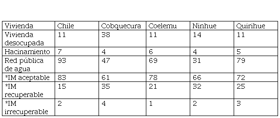 El despoblamiento es otra dimensión que agudiza el monocultivo forestal que se refleja en la gran cantidad de viviendas desocupadas, envejecimiento de la población y mala calidad de la vivienda que es una dimensión esencial (Alkire & Foster, 2011) (MDS, 2016).La Tabla 4 muestra que el acceso de agua en las viviendas en las comunas forestales es dramáticamente deficitario llegando a niveles de sólo un tercio en Ninhue versus el 93% de promedio nacional.