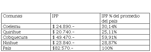Los resultados obtenidos presentan las magras condiciones socioeconómicas presentes en las Cobquecura, Coelemu, Ninhue y Quirihue, comunas pertenecientes a la provincia del Itata, región de Ñuble. El extractivismo y neo extractivismo se intensificó en el territorio desde principio de 1980 lo que ha determinado que las plantaciones forestales adquieran mayor terreno en desmedro de los cultivos tradicionales que van perdiendo terreno y con ello los propietarios de estos predios tengan que vender o arrendar a empresas forestales para subsistir en zonas de pobreza rural que se ha mantenido pese a la llegada industrialización a la zona, la que estuvo detenida por mucho tiempo privilegiando otras zonas del centro sur del país.