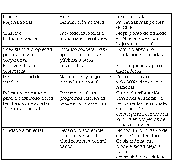 Se señala que las instalaciones de la industria forestal en Ñuble fue una política pública que, a mediados del siglo pasado, una zona que contaba con las condiciones propicias para la producción de pino y eucaliptus, además, con la perspectiva de proyectarse como una zona industrializada (Reyes,2003). Tampoco se cumplió la promesa neo extractivista de que empresas extractivistas tienen como objetivo impulsar el crecimiento económico, mayor empleabilidad, mejorar el flujo económico para otras áreas del comercio local y combatir la pobreza (Gudynas, 2011). En el Itata, la pobreza rural se mantuvo pese a la presencia extractivista debido a la no tributación y el rol subsidiario del Estado ausente que no ha generado clúster relevante ni recursos para otras áreas del desarrollo en beneficio social de las comunidades que conviven con las forestales.