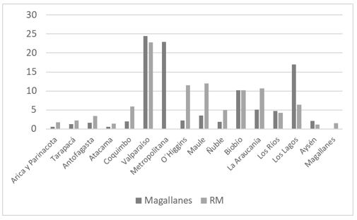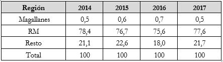 Como es posible observar, la información de los últimos cuatro años disponibles da cuenta de que, más de tres cuartos de la base imponible total del país se recaudan en la RM. Mientras que en la Región de Magallanes se origina apenas el 0,5% del total.