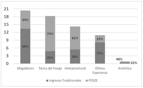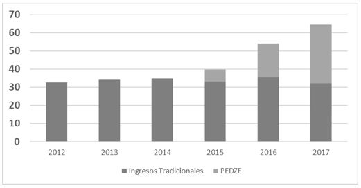 Como se aprecia en el Gráfico 1, para el año 2017, los ingresos provenientes del PEDZE hicieron duplicar el presupuesto total del GORE Magallanes con relación a la trayectoria que evidenciaban los ingresos tradicionales en los años anteriores.