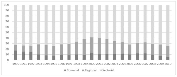 Esto constituye un problema crónico de Chile en perspectiva histórica, pues si bien ha habido períodos en que la inversión desarrollada en base a decisión dentro de las regiones fue ganando espacio con respecto al total (por ejemplo, entre 1997 y 2000), la tendencia muestra claramente un predominio hacia la influencia que ejerce el gobierno central en esta materia desde los distintos ministerios. Para el período comprendido entre 1990 y 2010, el promedio de la inversión realizada, decidida regional y comunalmente fue de un 31% del total, versus un 69% que se decidió a nivel sectorial. Esto se puede apreciar en el siguiente gráfico.