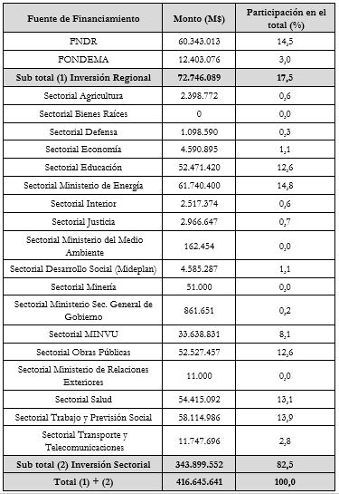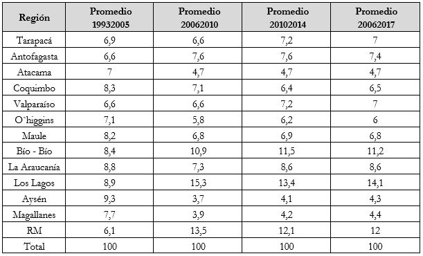La Subsecretaría de Desarrollo Regional (SUBDERE), define el FNDR como "un programa de inversiones públicas, con fines de compensación territorial, destinado al financiamiento de acciones en los distintos ámbitos de infraestructura social y económica de la región, con el objetivo de obtener un desarrollo territorial armónico y equitativo".6 A continuación, se detalla la distribución regional del FNDR para el período 1993-2017.