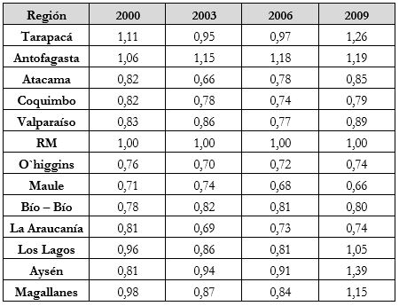 Un valioso esfuerzo por calcular y expresar las verdaderas trayectorias inflacionarias de las regiones de Chile es el trabajo de Aroca y López (2012), quienes estudiaron el desarrollo de los precios de las viviendas a través del tiempo desde una perspectiva regional, entendiéndolo como una buena aproximación al costo de la vida en los territorios. Un resultado interesante de esta investigación se visualiza en el siguiente cuadro.