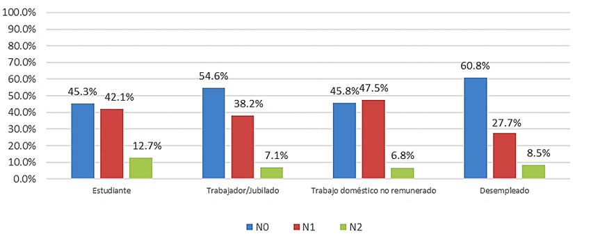 En cuanto a la situación laboral, el Gráfico 1 nos muestra cómo son los ciudadanos encuestados. En situación estudiantil son los que presentan mayor nivel de conocimiento y uso del open data a nivel aplicado (12.7%) en comparación con el resto de subgrupos que hicieron parte de la muestra. Mientras que los encuestados en condición de desempleo fueron los que poseían menor nivel de conocimiento o uso nulo del open data.