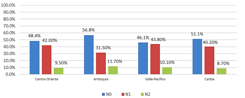 En cuanto a la región de residencia de los encuestados en Colombia, el Gráfico 2 nos muestra cómo la región de Antioquia es donde se observa un mayor porcentaje de ciudadanos con niveles nulo de conocimiento o uso del open data, contrastando con la tendencia observada en el Gráfico 1, es decir: más del 88% de los encuestados se ubicaron entre el nivel nulo o conceptual alrededor del tema aquí abordado.