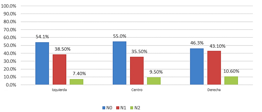 En cuanto al nivel de conocimiento y uso del open data, de acuerdo con la orientación ideológica de los ciudadanos encuestados, observamos en el Gráfico 3 que aquellos que autodefinieron su orientación ideológica como de derecha fueron los que presentaron mayor porcentaje de miembros con un NOD conceptual (N1) y aplicado (N2) (43.1% y 10.6%, respectivamente); mientras que los que se identificaron de centro o izquierda mantuvieron niveles afines y presentaron niveles de conocimiento y uso nulo del open data.