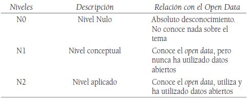 Solo un 9.7% de los encuestados presentan un nivel aplicado de conocimiento y uso del open data en Colombia. La mayoría de la población estudiada se encuentra en los niveles únicamente conceptuales (conocen sobre el movimiento Open Data) o de desconocimiento total sobre el tema propuesto (40% y 50.3%, respectivamente). En otras palabras, el uso de los datos abiertos pareciera estar siendo empleado por un porcentaje muy bajo de habitantes, lo que llevaría al movimiento vinculado a ello con una masa crítica de ciudadanos capaces de sacar provecho de este tipo de datos (cifra poco relevante en términos porcentuales al interior de Colombia).
