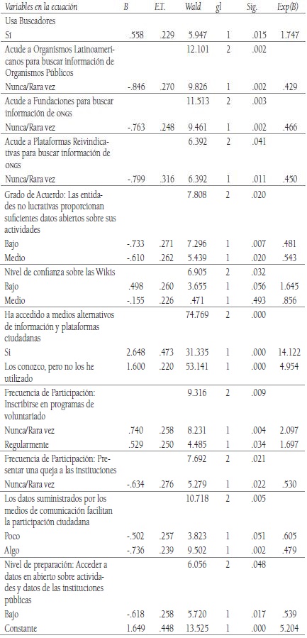 De todos los factores presentados en la Tabla 2, los que presenta una mayor relevancia en la probabilidad de contar con usuarios de open data o, al menos, que conozcan este tipo de movimientos son los que tienen acceso a medios alternativos de información y plataformas ciudadanas (ExpB: 14,122) y los que acuden a internet para buscar información, aunque con mucha menor intensidad, a través de motores de búsqueda (por ejemplo, Google, Bing, Google Academy).