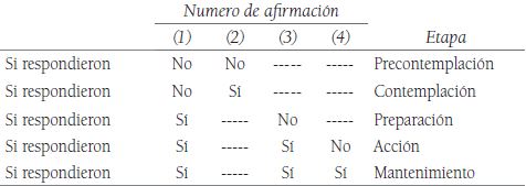 Etapas de cambio. Se definió solicitando a los estudiantes que leyeran el siguiente encabezado: “La actividad física o ejercicio incluye actividades tales como caminar rápidamente, correr, andar en bicicleta, nadar o cualquier otra actividad en la que el ejercicio es al menos tan intenso como estas actividades”. Posteriormente se le pidió que marcara Sí o No con respecto a las siguientes afirmaciones: (1) Actualmente soy físicamente activo. (2) Tengo la intención de ser físicamente más activo en los próximos 6 meses. Los que marcaron No respondieron la pregunta (2). Los que respondieron Sí en la pregunta (1) no respondieron la pregunta (2) y continuaron leyendo el siguiente encabezado: “Para que la actividad sea regular, se debe sumar al día un total de 30 minutos o más, por lo menos 5 días a la semana. Por ejemplo, usted podría hacer una caminata de 30 minutos o hacer tres de 10 minutos para un total diario de 30 minutos”. Posteriormente se le pidió al alumnado que marcara Sí o No con respecto a las siguientes afirmaciones: (3) Yo actualmente realizo una actividad física regular. (4) Yo llevo realizando actividad física regular durante los últimos 6 meses. Los sujetos fueron ubicados en una de estas cinco etapas de cambio siguiendo el algoritmo presentado en la Tabla 1.