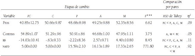 Al analizar las medias de la percepción de los pros y las etapas de cambio, la prueba post hoc de Tukey reveló que los participantes en la precontemplación tienen una percepción más baja de las ventajas de realizar ejercicio físico que aquellos en la preparación, acción, contemplación y mantenimiento (PC < P, A, C, M).