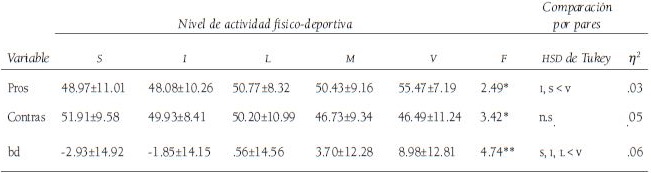 Balance decisional según el nivel de actividad físico-deportiva. Los resultados del ANOVA reveló diferencias significativas entre la percepción de los pros (F(4,280) = 2.49, p < .05, h2 = .03), contras (F(4,280) = 3.42, p < .05, , h2 = .05) y el balance decisional (F(4,280) = 4.74, p < .01, h2 = .06) con el nivel de actividad físico-deportiva (véase Tabla 3).