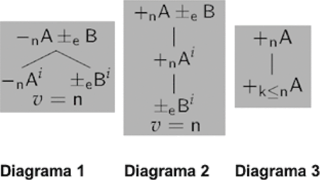 El Diagrama 1 ilustra la regla para las proposiciones de tipo universal (i.e., aquellas cuyo primer término es “-”); el Diagrama 2, la regla para las proposiciones de tipo particular (i.e., aquellas cuyo primer término es “+”). Después de aplicar cada regla introducimos un índice i∈{1, 2, 3, …} y generamos un vector de valores v con el número n del término asociado. Para las proposiciones de tipo universal, el índice puede ser cualquier natural; para las proposiciones de tipo particular, el índice tiene que ser un nuevo natural si dichas proposiciones no tienen ya un índice asociado. El Diagrama 3 es una regla de ordenamiento para términos atómicos con signo “+”. Adicionalmente, y siguiendo los principios de TFL, asumimos las siguientes reglas de negación: −(±A) =∓A, −(±A±B)= ∓A∓B y −(−−A−−A)=+(−A)+(−A).