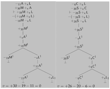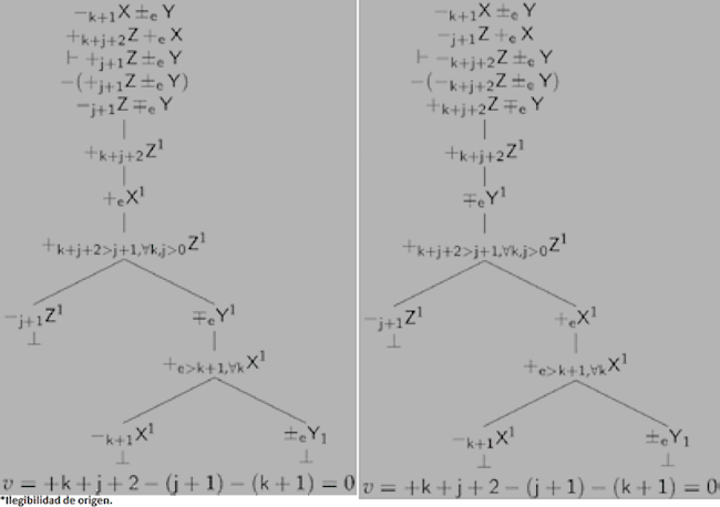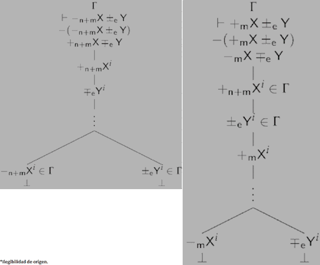 Supongamos, entonces, que tenemos una instancia del árbol del Diagrama 11 pero que su correspondiente inferencia no es válida, es decir, donde Γ+=Γ∪{+n+mX∓eY}, Γ+⊢⊥, pero la aplicación de las condiciones de inferencia de NTL a Γ no nos permite producir -n+mX±eY. Ahora bien, como el árbol del Diagrama 11 es completo, las puntas están cerradas, por lo que en nodos previos el árbol tiene que incluir algo de la forma -m+nX±eY o algo de la forma −mZ±eY y −nX+eZ, es decir, Γ={-m+nX±eY} o bien Γ={...,−mZ±eY, −nX+eZ, ...}. Pero si esto es así, en cualquiera de los dos casos, si aplicamos la condición i) a Γ obtenemos algo de la forma -X±eY, y no al revés, por la condición ii); y por último, por la condición iii) (a), la conclusión tiene que ser algo de la forma -m+nX±eY para que la suma de los valores numéricos sea igual a 0. Pero esto contradice la suposición de que no podemos construir una prueba de tal conclusión usando las condiciones de inferencia de NTL. Lo mismo ocurre, mutatis mutandis, para el árbol del Diagrama 12. Así, Γ={+mX±eY} o bien Γ={...,−nZ±eY, +m+nX+eZ, …}. En cualquiera de los dos casos, si aplicamos la condición i) a Γ obtenemos algo de la forma +mX±eY, y no al revés, por la condición ii); y por último, por la condición iii) (b), la conclusión tiene que ser algo de la forma +mX±eY. Pero esto contradice la suposición de que no podemos construir una prueba de tal conclusión usando las condiciones de inferencia de NTL.