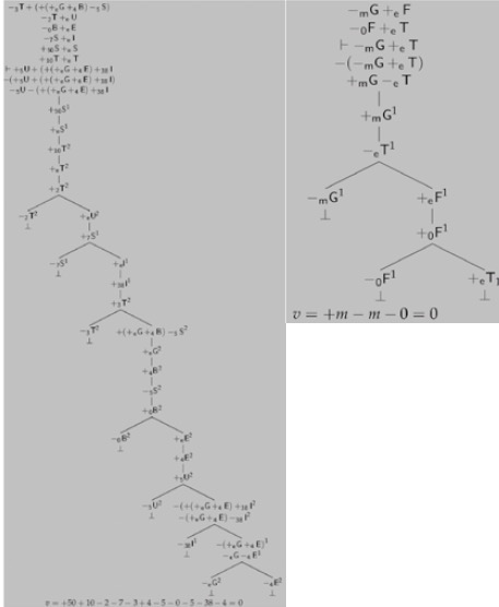 Sin pérdida de generalidad, consideremos las inferencias NTL válidas del Cuadro 14. Entonces tenemos dos Alternativas cuyas conclusiones son, respectivamente, -n+mZ±eY y +mZ±eY. Ahora, como el árbol es completo, las reglas para generar dicho árbol deben haber sido aplicadas; y como el árbol es cerrado y v=0, cada árbol debe ser de una de las siguientes siguientes formas (Diags. 11 y 12):