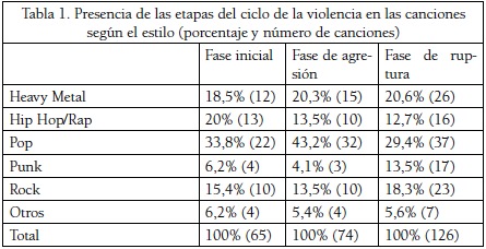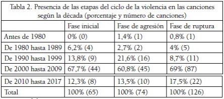 El análisis de la información obtenida se ha centrado, en primer lugar, en las canciones que recogen una o dos de las fases del ciclo de la violencia en sus letras y, en segundo lugar, en aquellas canciones que recogen el ciclo completo, es decir, las tres fases (fase inicial, fase de agresión y fase de ruptura).