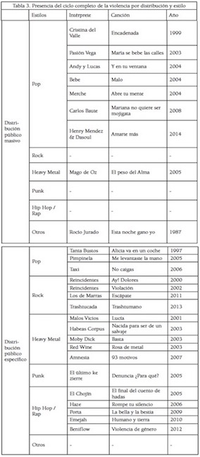 La segunda parte del análisis se centra en las canciones que recogen en sus letras el ciclo de la violencia completo. El resultado obtenido es que éstas representan el 12,8% del total (27 canciones). En la Tabla 3 se muestran las canciones que, dentro de nuestra muestra, presentan el ciclo completo teniendo en cuenta el tipo de distribución (público masivo o específico), el estilo y el año de publicación.