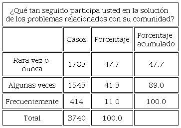 De acuerdo con los datos de la Tabla 1, la participación de los ciudadanos mexicanos en asuntos relativos con problemas de comunidad tiende a ser poco frecuente. Aproximadamente, uno de cada dos ciudadanos sostiene que rara vez o nunca participa, mientras que un 41% sólo lo hace algunas veces. Apenas el 11% que participar de manera frecuente en la solución de problemas de su comunidad.