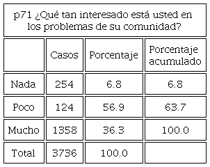 La Tabla 2 muestra que casi dos terceras partes de la ciudadanía se interesa poco o nada por los problemas de su comunidad. Esto pudiera ser revelador por un lado del nivel de apatía generalizada, puesto que los asuntos comunitarios son más cercanos y por tanto, sería esperable un mayor interés por aquello que atañe directamente a la vida de las personas. Una primera lectura de estos datos indicaría que esta falta de interés se debe a que buena parte de estos asuntos son resueltos de forma particular por los ciudadanos, y por lo tanto es innecesario un mayor involucramiento. Una interpretación alternativa indicaría que los ciudadanos no se involucran porque, incluso sin poder darle una respuesta particular a estos problemas, esperan que sea el gobierno quien los resuelva.