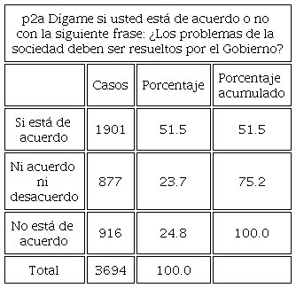 Los resultados de la Tabla 3 indican que, efectivamente, los ciudadanos en su mayoría consideran que los problemas públicos deben ser resueltos por el gobierno (51.6%). Sólo uno de cada cuatro, no está de acuerdo con esta frase, mientras que un 23.7% restante, no se pronuncia a favor de una u otra postura. Ello parece configurar que, en general, se responsabiliza a las autoridades de la (falta de) respuesta a los problemas comunitarios. Y buena parte del deterioro de los bienes públicos podría entenderse entonces, como resultado de la combinación de falta de interés de los ciudadanos -por considerar que es responsabilidad de los gobiernos- así como de los bajos desempeños gubernamentales, poco preocupados por rendir cuentas en un contexto de apatía y desinterés.