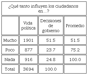 La Tabla 4 indica que en alguna medida el poco interés e involucramiento ciudadano pudiera darse también como consecuencia de que, desde su percepción, su capacidad de incidencia en el proceso políticas públicas. Si bien un 46.5% considera que los ciudadanos pueden influir mucho en la vida política, este porcentaje se reduce a 28.7% en el caso de las decisiones del gobierno. Menos de 3 de cada 10 mexicanas y mexicanos consideran que su participación puede producir efectos el proceso decisorio.
