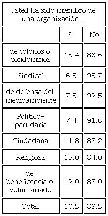 La Tabla 5 muestra que la membresía suele ser baja. Esto probablemente sea algo normal para ciertas organizaciones como las que tienen que ver con la defensa del medioambiente, las sindicales y las político-partidarias, pero es más problemático cuando se da en organizaciones ciudadanas y especialmente de colonos o condóminos, ya que en ellas es donde deben debatirse y decidirse las soluciones a los problemas más cercanos a la vida de la gente.
