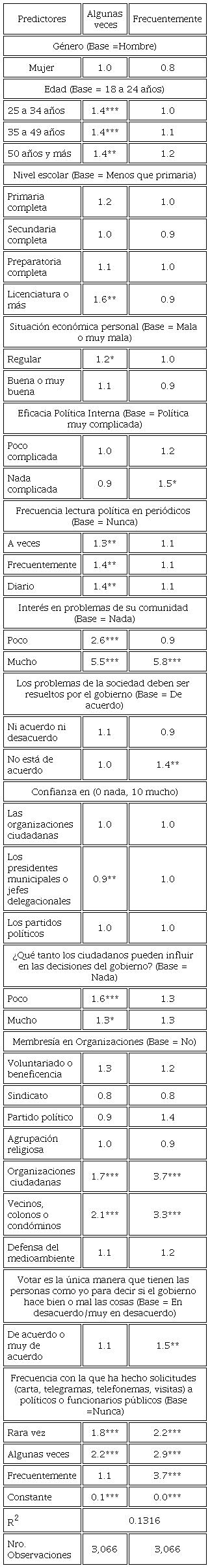 Entre los factores sociodemográficos, la edad y los niveles de escolaridad tienen un impacto sobre la frecuencia en la participación. Mientras que la frecuencia de la participación aumenta con la edad los adultos jóvenes y adultos (de 25 a 49 años) participan más que los más jóvenes (de 18 a 24 años), esta tendencia se mantiene entre los adultos mayores, aunque el coeficiente tiene menor significancia estadística. Por su parte, en el caso de la escolaridad, los que poseen un grado universitario (en México, ello representa aproximadamente un quinto de la población de acuerdo con el censo del 2020) tienen una propensión mayor a participar que quienes tienen menor escolaridad.