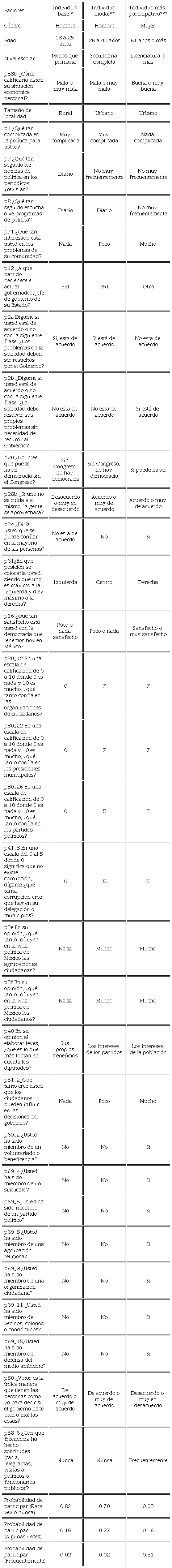 Lo primero que observamos que los individuos “base” y “modal” son más similares. No sólo en las probabilidades de participar, sino -lógicamente- también en los factores explicativos más relevantes (de mayor significancia estadística). Si bien el nivel educativo del individuo base es más bajo, en ambos casos su situación económica es mala o muy mala, y ambos creen que la política es muy complicada. Por lo general están poco o nada interesados por los asuntos públicos, y ambos coinciden en que es el gobierno quien debe resolver los problemas de su comunidad. Por ello quizás, están poco satisfechos con la democracia en México, y consideran que los legisladores no tomen en cuenta sus intereses a la hora de hacer las leyes. Para ambos tipos de ciudadanos, votar es la única manera de expresar su opinión sobre el desempeño gubernamental, y no es sorpresivo entonces que su experiencia de participación en organizaciones o en procesos de interlocución con las autoridades sea poca o nula.