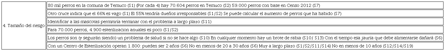 Es difícil evaluar el número de animales en grandes áreas territoriales, sin embargo, los cálculos se han realizado tomando el número actualizado de personas en una comuna y el número estimado de perros por persona (1 perro por cada 3, 4 o 5 personas son las escalas). Un cálculo más conservador toma como fuente oficial el Censo de 2012 y afirma que hay 59,000 perros en Temuco. Así, para el período 2012-2018 se calcula entre 59.000 y 80.000 perros en la comuna. Este trabajo no es insignificante, ya que su propósito es superar las dificultades metodológicas para predecir los impactos de las intervenciones políticas. La literatura en este punto indica que los datos generados en la identificación de riesgos son frecuentemente inciertos (Rothstein y Downer, 2012).