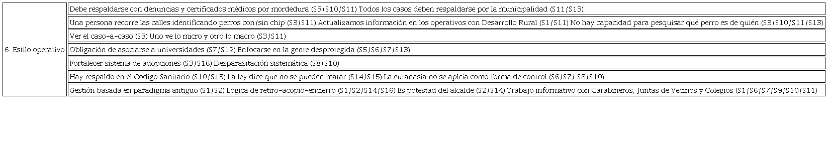 El establecimiento de criterios de estilo operativo tiene varias dimensiones. Una es el vínculo entre las organizaciones civiles y el municipio, que no opera en todas las comunas. En las que opera, lo hace a través de una división del trabajo orientada a la identificación de perros y gatos callejeros y de dueños irresponsables, con las OPA que investigan caso por caso y un municipio que realiza acciones públicas, como campañas de esterilización y promoción.