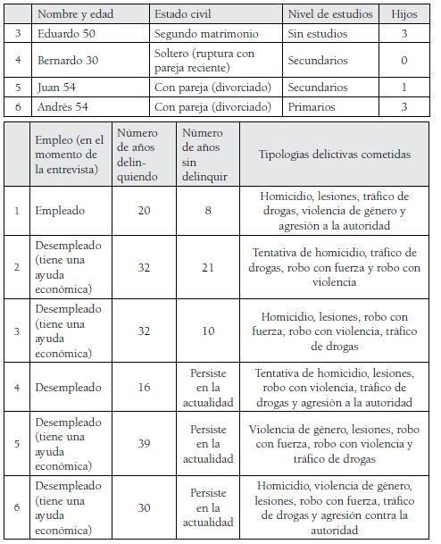 Se contactó con los participantes a través de varias organizaciones de la Comunidad Valenciana (España) dedicadas a la reinserción de personas con antecedentes delictivos; concretamente, Casal de la Pau, Confraternidad Carcelaria de España (CONCAES) y Programa Contexto e Iniciatives Solidaries. Estas instituciones garantizaron la ausencia de actividades delictivas en tres de los participantes -los clasificados como “desistentes”-. En el caso de los “persistentes”, en el momento de realizarse el estudio, dos tenían causas judiciales pendientes por delitos recientemente cometidos: uno había agredido a su expareja y el otro había atacado a las autoridades policiales. Los tres manifestaron durante la entrevista su intención de mantener la actividad delictiva en el futuro -o estar desarrollándola en ese momento- así como una visión pesimista sobre sus posibilidades de reinserción.