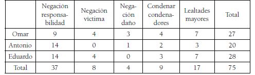 La segunda estrategia más utilizada para mitigar el perjuicio de sus acciones fue la alusión a lealtades mayores -17 entre los tres-: 7 Omar y Eduardo, 3 Antonio. Todos manifestaron que en algún momento de su vida cometieron actos reprochables para proteger un bien superior: la vida de otros. Eduardo justificó muchos de sus atracos alegando que eran para dejar sustento a su familia antes de ingresar en prisión; Omar argumentó que algunos de sus enfrentamientos fueron para proteger a presos injustamente agredidos: