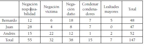 También se utilizó la apelación a lealtades mayores para atenuar el daño causado por los crímenes más graves -los homicidios-, si bien tales argumentos fueron acompañados por estrategias para rechazar a sus víctimas: Omar reconoció que mató a un superior suyo -a quien calificó como “un demonio”- durante un conflicto bélico en África, para proteger a un grupo de civiles que iban a ser injustamente fusilados; Eduardo justificó su crimen asegurando que protegía a su madre de un “psicópata” que intentaba violarla. Antonio, por su parte, declaró que “no fue él” quien atentó contra la vida de su amigo, sino que fue su “yo oscuro”, controlado por la drogodependencia -negación de la responsabilidad-. A pesar de los medios utilizados para mitigar la inmoralidad de sus acciones, todos expresaron un gran arrepentimiento por tales actos: