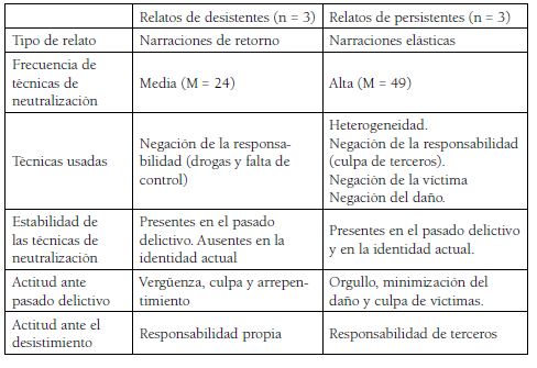 El grupo de “persistentes” exhibió un mayor número y variedad de técnicas de neutralización -siendo las más prevalentes, en orden decreciente, la negación de la responsabilidad, la negación del daño y la negación de la víctima, respectivamente-. A diferencia de los que desistieron de la delincuencia, el rechazo de las víctimas y la mitigación del daño ocasionado fueron muy usados para justificar, minimizar y normalizar el uso de la violencia grave. Debido a ello, los participantes mostraron un escaso arrepentimiento por sus actos pasados, si bien aseguraron pequeños cambios en su manera de ser y un supuesto distanciamiento de los factores que promovían su actividad criminal. Tales manifestaciones, sin embargo, fueron incoherentes e incongruentes en diversos segmentos de su discurso, ya que también se definieron incapaces de alejarse de la vida criminal y culparon de esto a sus circunstancias externas.